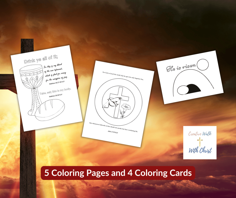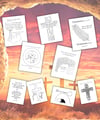 A set of 5 Easter Bible coloring pages and 4 Easter Bible coloring cards.