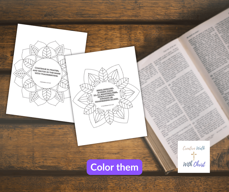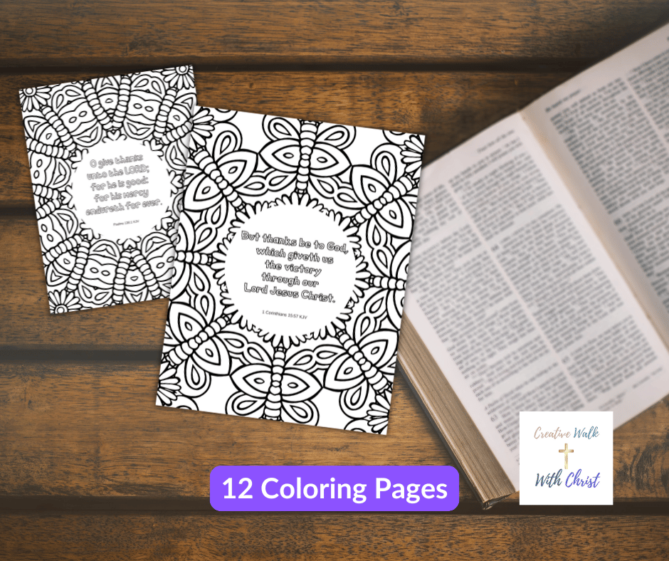 A set of 12 Bible verse coloring pages in JPEG and PDF format.