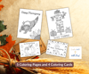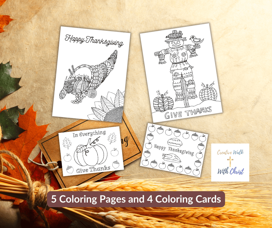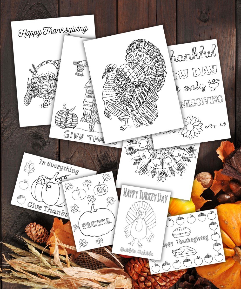 A set of 5 Thanksgiving themed coloring pages and 4 Thanksgiving themed coloring cards.